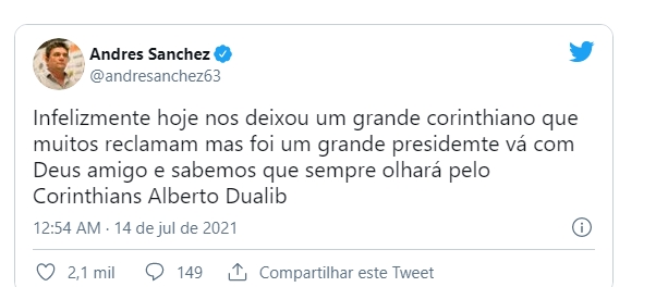 “Infelizmente hoje nos deixou um grande corinthiano que muitos reclamam, mas foi um grande presidente. Vá com Deus, amigo. E sabemos que sempre olhará pelo Corinthians, Alberto Dualib”, postou.