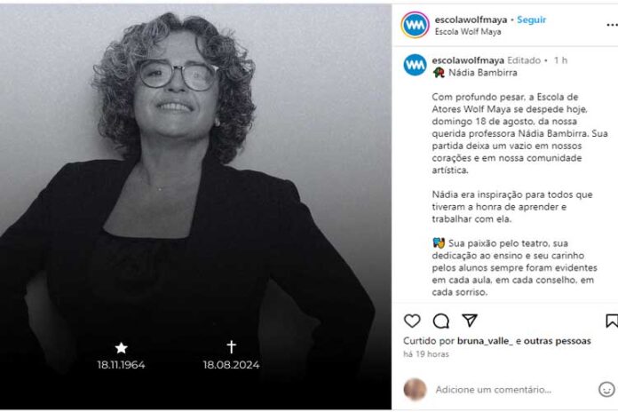 “Com profundo pesar, a Escola de Atores Wolf Maya se despede hoje, domingo, 18 de agosto, da nossa querida professora Nádia Bambirra. Sua partida deixa um vazio em nossos corações e em nossa comunidade artística. Nádia era uma inspiração para todos que tiveram a honra de aprender e trabalhar com ela”, diz o comunicado.