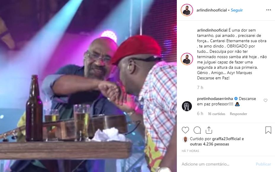 Arlindinho, afilhado do artista, lamentou a perda em sua conta oficial no Instagram. “É uma dor sem tamanho, pai amado, precisarei de força… Cantarei eternamente sua obra! Te amo, dindo! OBRIGADO por tudo… Desculpa por não ter terminado nosso samba até hoje, não me julguei capaz de fazer uma segunda a altura da sua primeira. Gênio, amigo… Acyr Marques Descanse em Paz!”, escreveu ele.