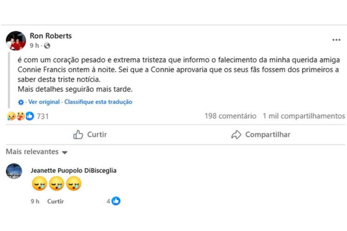 A notícia foi confirmada por Ron Roberts, amigo da cantora, em publicação nas redes sociais. O perfil de Ronnie também fez um post lamentando o ocorrido. “É com o coração pesado e extrema tristeza que informo o falecimento da minha querida amiga Connie Francis na noite passada. Sei que Connie aprovaria que seus fãs fossem os primeiros a saber desta triste notícia. Mais detalhes serão divulgados posteriormente” , disse Roberts.