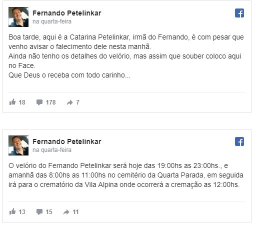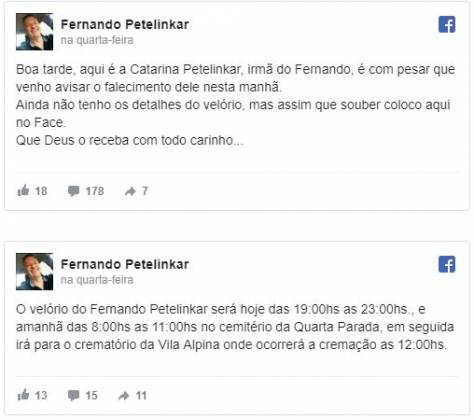 “Boa tarde, aqui é a Catarina Petelinkar, irmã do Fernando, é com pesar que venho avisar o falecimento dele nesta manhã”, escreveu ela.
