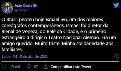 O governado de São Paulo, João Doria, lamentou a perda de um dos maiores nomes da dança no Brasil. “O Brasil perdeu hoje Ismael Ivo, um dos maiores coreógrafos contemporâneos. Ismael foi diretor da Bienal de Veneza, do Balé da Cidade, e o primeiro estrangeiro a dirigir o Teatro Nacional Alemão. Era um amigo querido. Muito triste. Minha solidariedade aos familiares”, escreveu no Twitter.