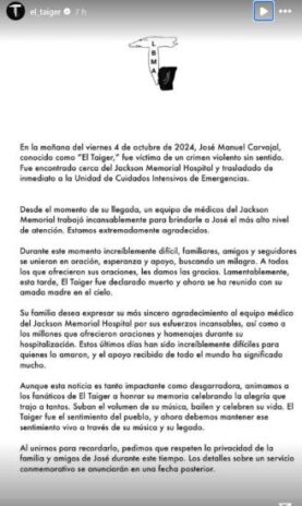 Segundo a publicacão, o El Taiger morreu na tarde desta mesma data e ele estava internado no Jackson Memorial Hospital, em Miami: “Na manhã de 4 de outubro de 2024, José Manuel Carvajal, conhecido como El Taiger, foi vítima de um crime violento e sem sentido. Foi encontrado perto do Jackson Memorial Hospital e transferido imediatamente para a Unidade de Cuidados Intensivos de Emergência”, iniciou o comunicado da equipe.