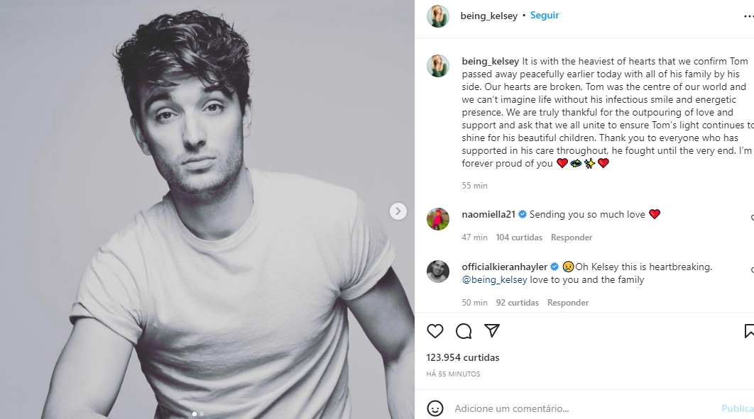 “É com o coração partido que confirmamos que Tom morreu hoje cedo ao lado de toda sua família. Nossos corações estão quebrados. Tom era o centro de nosso mundo e não conseguimos imaginar uma vida sem seu sorriso e presença”, disse Kelsey. Ele deixa a mulher e dois filhos, Aurelia, de 2 anos, e Bodhi, de 1 ano.