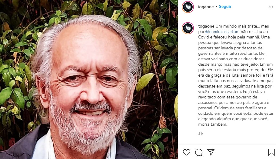 “Meu pai não resistiu ao covid [sic] e faleceu hoje pela manhã. Uma pessoa que levava alegria a tantas pessoas ser levada por descaso de governantes é muito revoltante. Ele estava vacinado com as duas doses desde março mas não teve jeito. Em um país sério ele estaria mais protegido. Danilo Lucas”