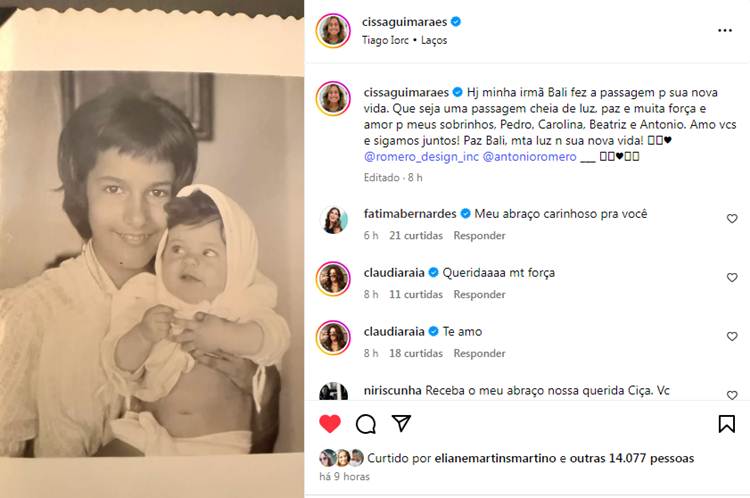 Em seu perfil no Instagram, Cissa publicou um post com imagens antigas da família para se despedir. “Hj minha irmã Bali fez a passagem para sua nova vida. Que seja uma passagem cheia de luz, paz e muita força e amor para meus sobrinhos, Pedro, Carolina, Beatriz e Antonio. Amo vcs e sigamos juntos! Paz Bali, muita luz na sua nova vida! @romero_design_inc @antonioromero” escreveu.