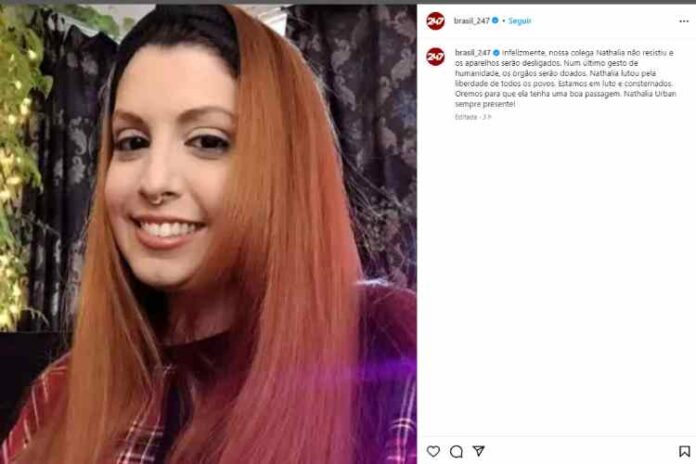 “Infelizmente, nossa colega Nathalia não resistiu e os aparelhos serão desligados. Num último gesto de humanidade, os órgãos serão doados. Nathalia lutou pela liberdade de todos os povos. Estamos em luto e consternados. Oremos para que ela tenha uma boa passagem. Nathalia Urban sempre presente!”, informou o portal ‘Brasil 247’.
