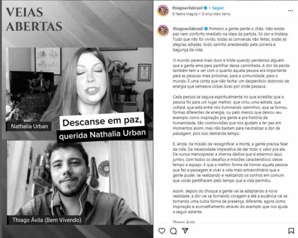 Thiago Ávila, militante da causa palestina e ativista internacionalista, usou as redes sociais para lamentar a morte da amiga. Ele publicou um vídeo com ela no programa ‘Veias Abertas’ e descreveu: “Descanse em paz, querida Nathália Urban”.