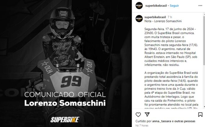 “O SuperBike Brasil comunica, com muita tristeza e pesar, o falecimento do piloto Lorenzo Somaschini nesta segunda-feira (17/6), às 19h43. O argentino, natural de Rosário, estava internado no Hospital Albert Einstein, em São Paulo (SP), sob cuidados médicos intensivos e, infelizmente, não resistiu”, diz a nota divulgada no Instagram.