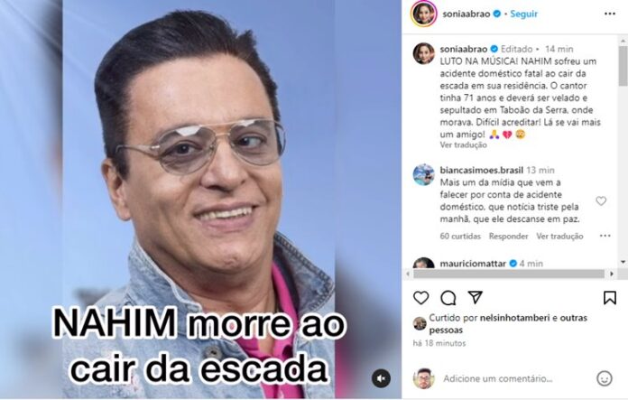 A informação inicial sobre a morte do renomado artista se deu através da apresentadora Sonia Abrão. Pelas redes sociais, ela compartilhou a triste notícia, pegando a todos de surpresa: “LUTO NA MÚSICA! NAHIM sofreu um acidente doméstico fatal ao cair da escada em sua residência. O cantor tinha 71 anos e deverá ser velado e sepultado em Taboão da Serra, onde morava. Difícil acreditar! Lá se vai mais um amigo!“, escreveu ela, anunciando a morte do amigo.
