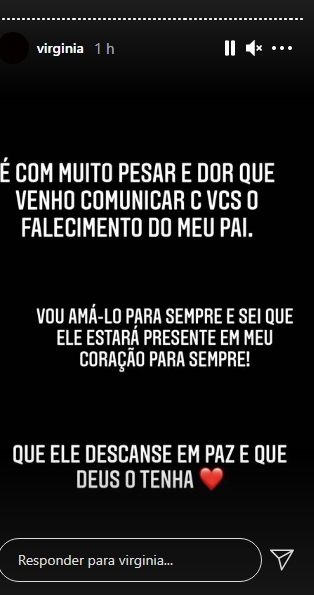 Através de seus Stories Virginia fez uma postagem, prestando sua homenagem ao pai declarando todo seu amor: “É com muito pesar e dor que venho comunicar vocês o falecimento do meu pai.