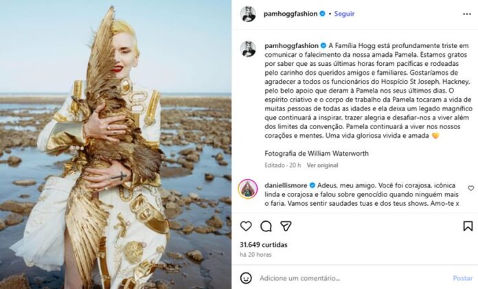 Por fim, a equipe destacou em nota: “Pamela continuará a viver nos nossos corações e mentes. Uma vida gloriosa vivida e amada“, disse. Nos comentários, amigos lamentaram sua partida: “Adeus, meu amigo. Você foi corajosa, icônica linda e corajosa e falou sobre genocídio quando ninguém mais o faria. Vamos sentir saudades tuas e dos teus shows. Amo-te“, disse Daniel Lismore.