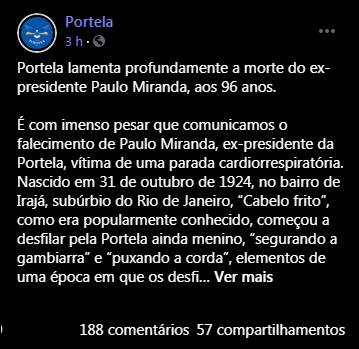 A agremiação divulgou nota de pesar nas redes sociais. Portela lamenta profundamente a morte do ex-presidente Paulo Miranda, aos 96 anos. É com imenso pesar que comunicamos o falecimento de Paulo Miranda, ex-presidente da Portela, vítima de uma parada cardiorrespiratória”, escreveu a equipe no Facebook.