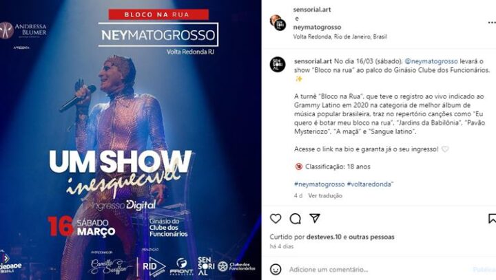 A turnê ‘Bloco na Rua’, que teve o registro ao vivo indicado ao Grammy Latino em 2020 na categoria de melhor álbum de música popular brasileira, traz no repertório canções como ‘Eu quero é botar meu bloco na rua’, ‘Jardins da Babilônia’, ‘Pavão Mysteriozo’, ‘A maçã’ e ‘Sangue latino’“. Aliás, eles ainda deixam claro que a classificação é para maiores de 18 anos.