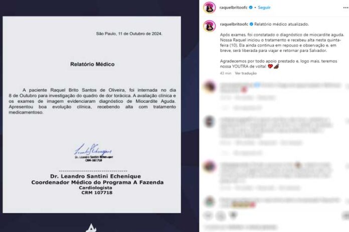 “A paciente Raquel Brito de Oliveira foi internada no dia 8 de outubro para investigação do quadro de dor torácica. A avaliação clínica e os exames de imagem evidenciaram diagnóstico de Miocardite Aguda. Apresentou boa evolução clínica, recebendo alta com tratamento medicamentoso”, afirma o relatório oficial. A informação põe fim às especulações envolvendo a suposta gravidez da peoa.