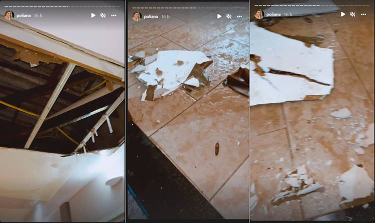 Ainda dentro do carro, voltando para casa, a influencer fez o relato: “A calha entupiu, entrou folha. Choveu muito hoje, o dia inteiro e o teto de gesso desabou. Minha mãe estava sentada na cozinha e não pegou nela nada. Gente como Deus é maravilhoso. Só gratidão“, explicou Poliana.