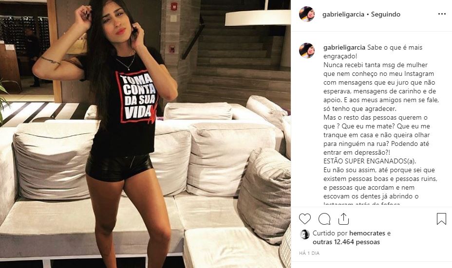 Gabrieli ainda disse que não está em busca da fama. “Não quero ganhar likes e muito menos uma fama temporária, por um assunto como esse e muito menos ficar aqui expondo como é a minha relação e a dele (isso só compete a nós dois). Então falem o que quiserem. Quero que apenas respeitem a minha família, até porque o meu ato não vai mudar e nem acrescentar nada na vida de vocês. Da minha vida cuido eu. Obrigada”, finalizou.