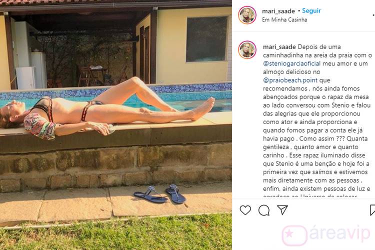 Em sua conta oficial do Instagram nesta quarta-feira (22), a artista contou que estava almoçando, quando um fã do ator surgiu no mesmo restaurante que ele e além disso, pagou a conta do almoço, o que comoveu Mari Saade.