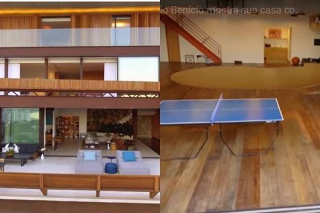Além de uma piscina, a área de lazer da casa ainda traz uma pista de skate, sala de jogos e rooftop [espécie de varanda/espaço].