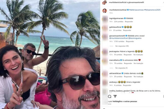 Murilo usou as hashtags “deferiascomex” e “felizanonovo2025”, divertindo os internautas. O atual marido de Antonelli, Leonardo Nogueira, pai das gêmeas Sofia e Antônia, também aparece no registro.