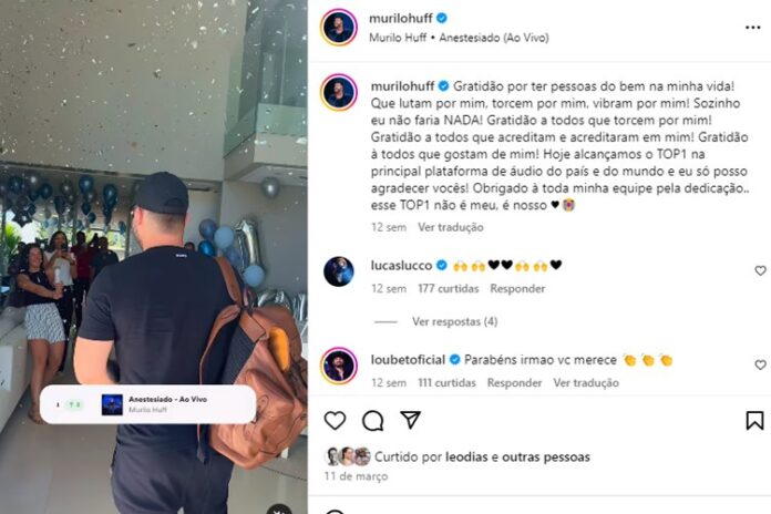 “Gratidão por ter pessoas do bem na minha vida! Que lutam por mim, torcem por mim, vibram por mim! Sozinho eu não faria NADA! Gratidão a todos que torcem por mim! Gratidão a todos que acreditam e acreditaram em mim! E gratidão à todos que gostam de mim! Hoje alcançamos o TOP1 na principal plataforma de áudio do país e do mundo e eu só posso agradecer vocês! Obrigado à toda minha equipe pela dedicação.. esse TOP1 não é meu, é nosso“, disse.