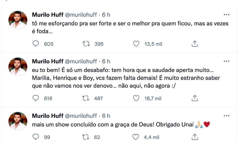 “Eu to bem! É só um desabafo: tem hora que a saudade aperta muito… Marilia, Henrique e Boy, vocês fazem falta demais! É muito estranho saber que não vamos nos ver de novo… não aqui, não agora. Tô me esforçando pra ser forte e ser o melhor pra quem ficou, mas às vezes é fod*“, afirmou ele.
