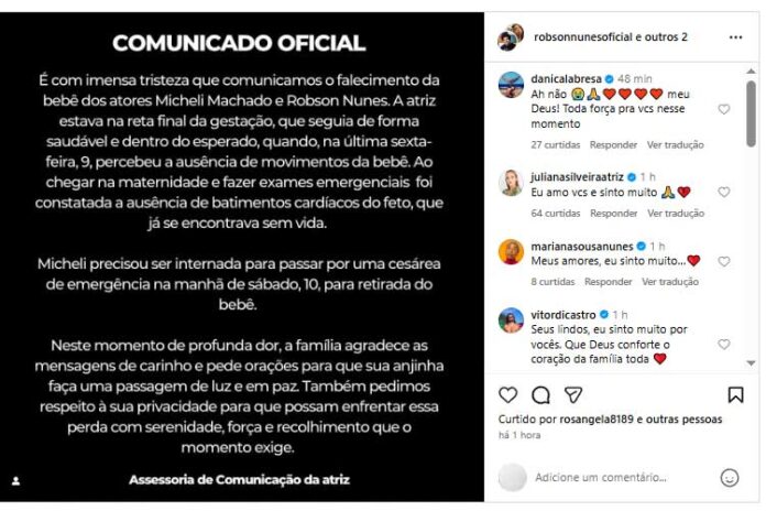 Nos comentários da publicação, amigos e seguidores lamentaram o ocorrido, prestando suas condolências após a morte do bebê. “Meu Deus! Toda força para vocês nesse momento”, desejou Dani Calabresa, que também está grávida do seu primeiro filho.