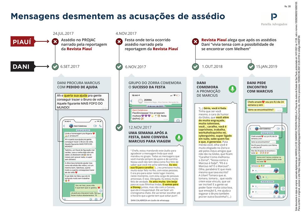 A princípio os advogados de Marcius Melhem questionam a reportagem da revista Piauí, comparando datas dos supostos assédios versus datas nas quais ele e Dani Calabresa tiveram contatos pessoais. Por fim, dentre as contradições apontadas pela defesa do ex-diretor da global está o suposto assédio sexual que teria acontecido do dia 24 de julho de 2017, nos estúdios da emissora. Em suma, o gráfico indica que, dois meses depois, mais precisamente no dia 6 de setembro, o ator e a apresentadora trocaram mensagens sobre o dia a dia profissional via WhatsApp.