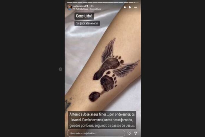 Nadja Haddad decidiu fazer uma homenagem aos filhos gêmeos, Antônio e José, e compartilhou o resultado nas redes sociais nesta quinta-feira (13). A apresentadora desenhou dois pezinhos simbolizando os herdeiros, sendo que um deles está acompanhado de asas de anjo devido ao falecimento de Antônio após o nascimento.