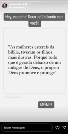 Por meio dos stories no Instagram, Nadja Haddad compartilhou uma reflexão sobre a esterilidade e enfatizou a sua opinião na legenda: “As mulheres estéreis da bíblia, tiveram os filhos mais ilustres. Porque tudo que é gerado debaixo de um milagre de Deus, o próprio Deus promove e protege“, dizia a mensagem publicada por ela. “AMÉM!!!“, legendou a artista em seguida, completando: “Hey, mocinha! Deus está falando com você!“, encerrou ela.
