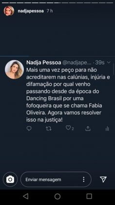 Além disso, mais um fato muito curioso é que recentemente, Nadja Pessoa quebrou o silêncio à respeito dessa história através de seu Instagram Stories. Aliás, ela acusou a jornalista Fábia Oliveira por calúnia, injúria e difamação após a matéria da jornalista. ”Mais uma vez peço para não acreditarem nas calúnia, injúria e difamação por qual venho passando desde a época do Dancing Brasil por uma fofoqueira que se chama Fábia Oliveira. Agora vamos resolver isso na justiça!”, ameaçou ainda.