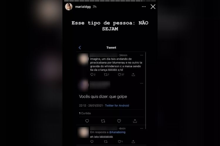 Com a relevância, as pessoas começaram a comentar e veio uma enxurrada de críticas. Uma até que começou legal: “Imagina, um dia está andando de Piracicabana por Blumenau, e no outro está grávida do Whindersson, com a Maísa sendo tia da criança. Que tudo”, disse, que foi respondida por uma: “Você quis dizer: Que golpe”. A moça então concordou: “É isto”.