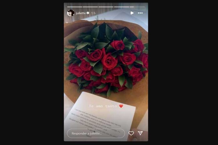 Juliette e o namorado, Kaique Cerveny, completaram um ano de namoro, e o rapaz decidiu dar um presente especial para a amada. Através de seu perfil no Instagram, neste domingo (27), a ex-participante do “BBB21” foi surpreendida com um buquê de rosas vermelhas, acompanhado de um cartão.