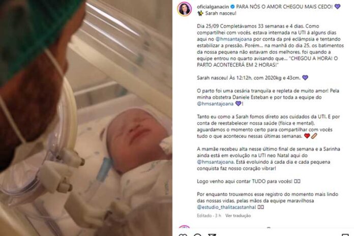 “Como compartilhei com vocês, estava internada na UTI há alguns dias aqui no @hmsantajoana por conta da pré-eclâmpsia e tentando estabilizar a pressão. Porém, na manhã do dia 25, os batimentos da nossa pequena não estavam dos melhores. Foi quando a equipe entrou no quarto avisando: ‘Chegou a hora! O parto acontecerá em 2 horas’. Sarah nasceu! Às 12h12, com 2,020 kg e 43 cm”, celebrou.