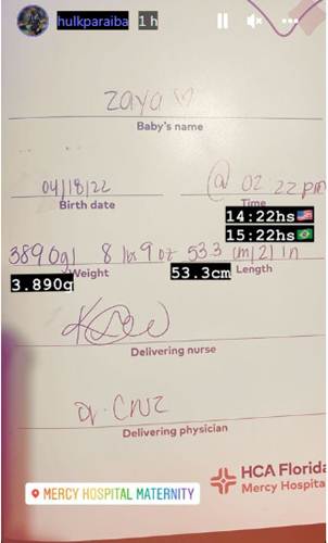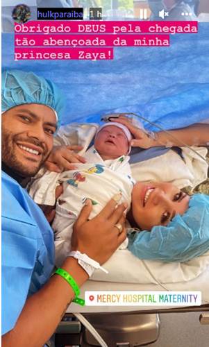Em seu Stories do Instagram, Hulk publicou um clique do casal ao lado da menininha e encantou na legenda: “Obrigado, Deus, pela chegada tão abençoada da minha princesa Zaya”.