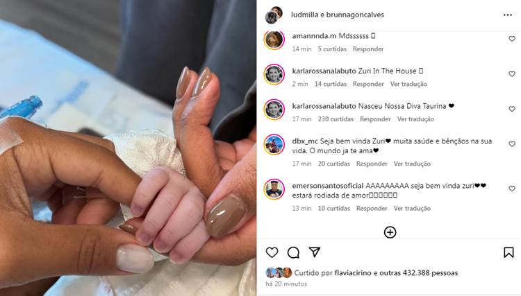 Nos comentários, amigos do casal comemoraram o nascimento do bebê. “Viva Zuriii, parabéns mamaessssss!!! Que Deus abençoe muitooooo”, escreveu Camila Queiroz. Silvana Oliveira, mãe de Ludmilla demonstrou a felicidade. “Seja bem vida minha Zuzu princesa da sua vovó , eu te amo meu amor !!!”, escreveu a vovó coruja