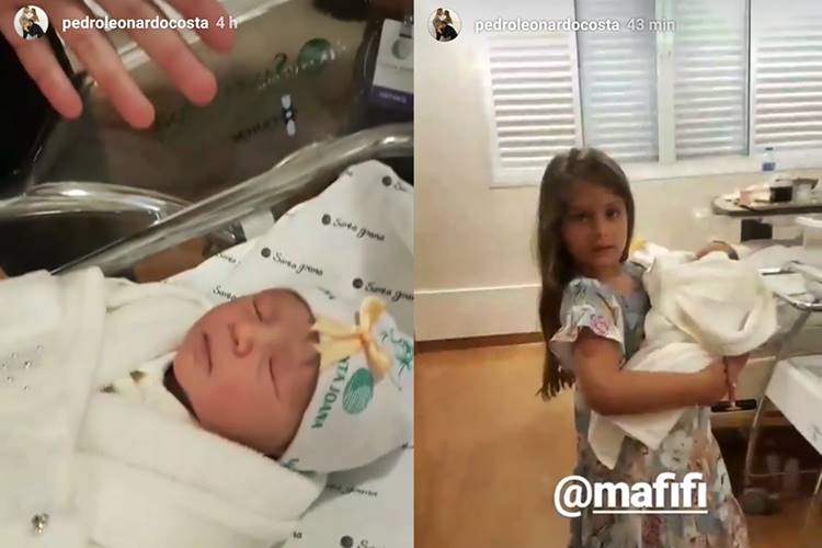 Momento fofura! O filho do cantor Leonardo, postou em seu InstaStories, fotos da recém-nascida e da irmãzinha segurando a caçulinha no colo.