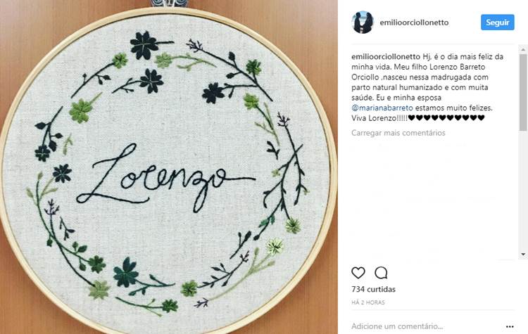 “Hoje é o dia mais feliz da minha vida. Meu filho Lorenzo Barreto Orciollo nasceu nessa madrugada com parto natural humanizado e com muita saúde. Eu e minha esposa @marianabarreto estamos muito felizes. Viva Lorenzo!!!“, escreveu o ator na legenda da publicação.