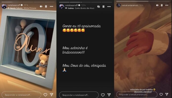 Na publicação nos stories do Instagram, Natália mostrou um enfeite de maternidade com o nome do pequeno. Logo depois, ela vibrou pelo quanto o sobrinho é lindo. “Gente, eu estou apaixonada. Meu sobrinho é lindo! Meu Deus do céu, obrigada“, celebrou.