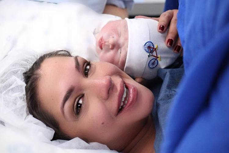 Na publicação, a atriz mostrou uma foto dos três após o parto e deu detalhes da chegada do mais novo membro da família.
