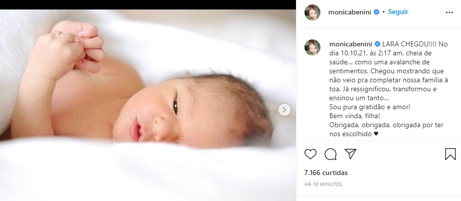 Ao final ela agradeceu a a filha: “Sou pura gratidão e amor! Bem vinda, filha! Obrigada, obrigada, obrigada por ter nos escolhido ♥️”.
