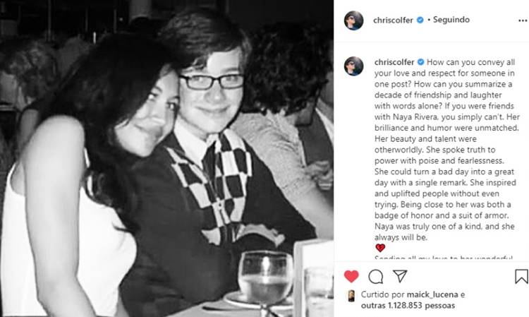 Na publicação em seu Instagram, Chris Colfer não economizou palavras para deixar bem claro o quanto sua amiga significava para ele: “Como você pode transmitir todo o seu amor e respeito por alguém em um post? Como você pode resumir uma década de amizade e risos apenas com palavras? Se você era amigo de Naya Rivera, simplesmente não pode. Seu brilho e humor eram incomparáveis. Sua beleza e talento eram de outro mundo. Ela falou a verdade ao poder com equilíbrio e destemor. Ela poderia transformar um dia ruim em um ótimo dia com uma única observação. Ela inspirou e elevou as pessoas sem nem tentar. Estar perto dela era ao mesmo tempo um distintivo de honra e uma armadura”, disse no post que acompanha um clique raro dos dois.