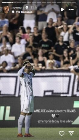 Através dos stories no Instagram, Neymar compartilhou um clique da partida contra o Inter de Limeira, vencido por 3 a 0, com direito a gol olímpico, celebrando o mesmo a estilo Depay. “AMIZADE existe sim entre RIVAIS! @MemphisDepay Love u bro“, publicou ele.