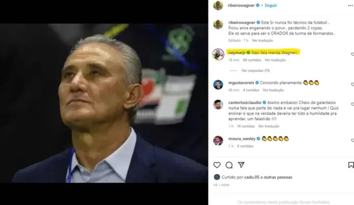 No entanto, ao se deparar com a postagem, Neymar logo respondeu nos comentários: “Não fala merd*, Wagner”, pediu ele. Em suma, os fãs do jogador logo reagiram e compartilharam o comentário do craque. Por sinal, o Brasil segue divido, uns defendem Tite e outros lhe detonam.