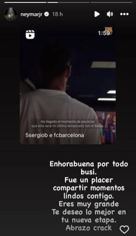 Dessa forma, por meio dos stories do Instagram, Neymar compartilhou o vídeo de despedida do amigo do clube espanhol e, na legenda, escreveu: “Parabéns por tudo Busi. Foi um prazer compartilhar momentos com você. Você é muito grande e te desejo o melhor em sua nova etapa. Abraço craque“, disse o brasileiro, emocionando os fãs com a postagem.