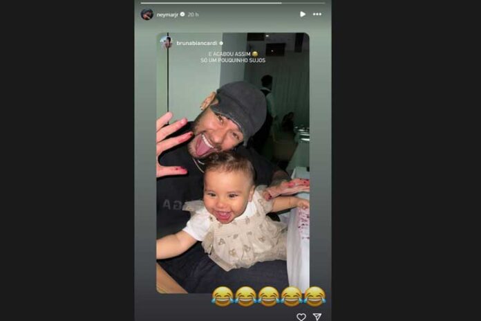 Mavie e Neymar aproveitaram um jantar para se divertirem bastante, e Bruna Biancardi usou seu Stories no Instagram para compartilhar o resultado nesta quinta-feira (15). No registro, ambos aparecem com as mãos sujas, encantando pelo momento entre pai e filha.