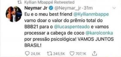 Um tweet fake de Neymar circulou pelas redes sociais. Na falsa publicação, o craque teria dito que ele e Kyllian Mbappé, também atleta do PSG, iriam doar R$ 1,5 milhão para Lucas e colocariam advogados a disposição para o ex-Brother processar a participante Karol Conka.