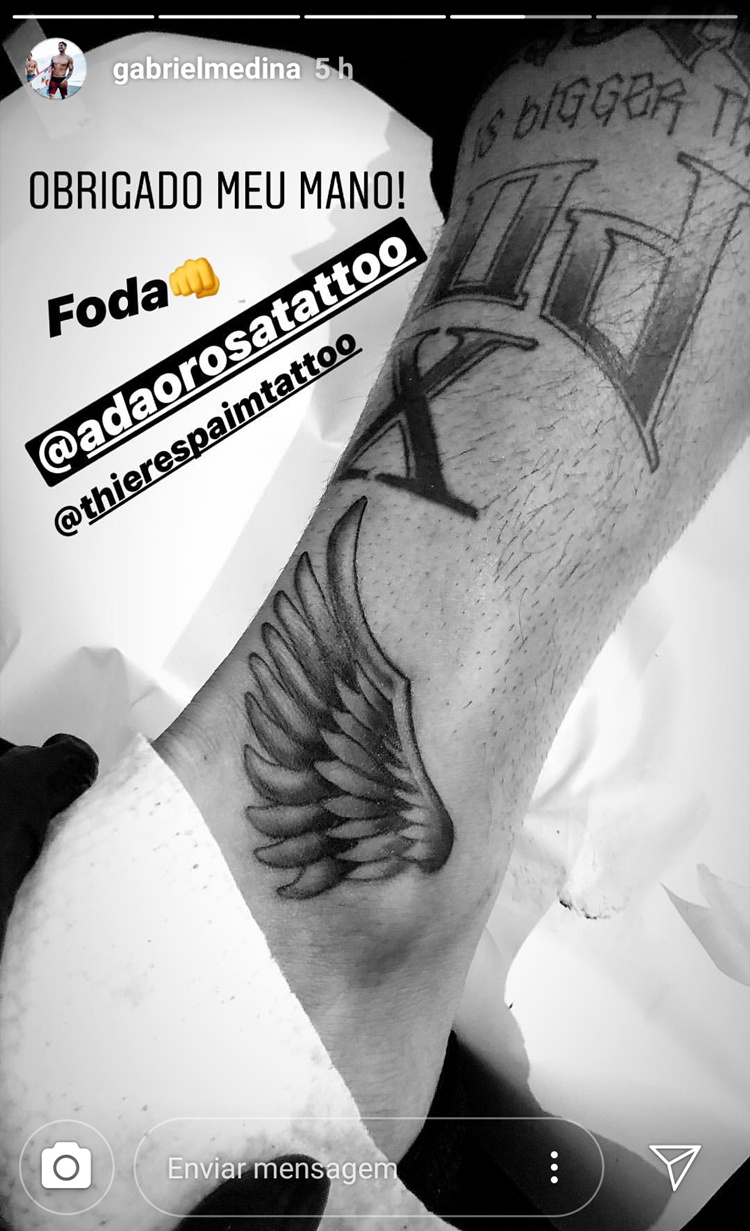 Quem também está em Paris é o surfista Gabriel Medina, que aproveitou e tatuou uma asa no braço.