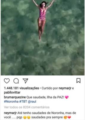 “Que saudade, ilha da paz“, legendou ela. “Até tenho saudades de Noronha, mas de você… pqp, saudades pra sempre“, escreveu ele, que já está de volta à França, onde joga pelo time de futebol Paris Saint-Germain.
