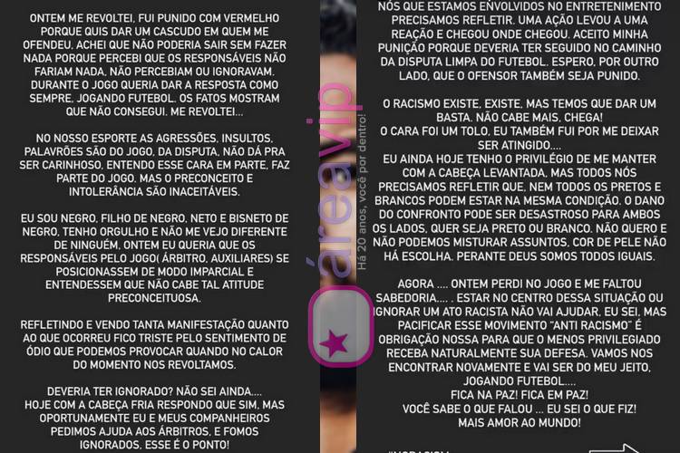 “Mas pacificar esse movimento antirracismo é obrigação nossa para que o menos privilegiado receba naturalmente sua defesa. Vamos nos encontrar novamente e vai ser do meu jeito, jogando futebol”, acrescentou o irmão de Rafaella Santos. Neymar, destacou que, mesmo acostumado com os insultos durante as partidas, não admite racismo. “No nosso esporte as agressões, insultos, palavrões são do jogo, da disputa. Não dá para ser carinhoso. Entendo esse cara em parte. faz parte do jogo, mas o preconceito e intolerância são inaceitáveis”, disparou.